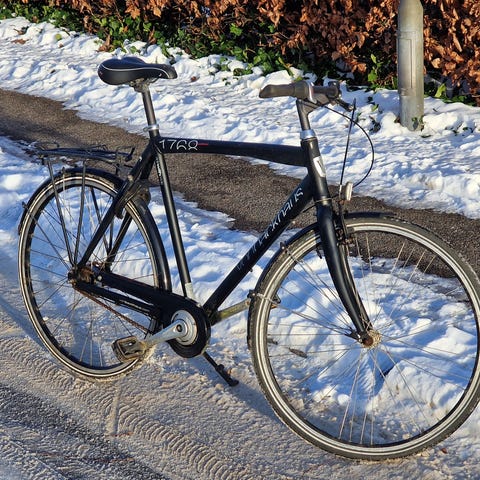 Meget stærk cykel med tre indvendige gear, tromlebremser og automatisk forlys når du kører. Den har nye dæk, men har naturligvis brugsspor. Står I Ølstykke, så kom og prøv den.