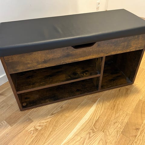 Super fin bænk med plads til 4 par sko under med 2,6 massiv egetræsplade på.