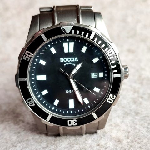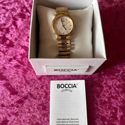 Dameur, Boccia, Titanium. All Titanium, også remmen. Swarovski krystaller omkring urskiven. Anbefales hvis man ikke tåler nikkel. Betegnelse: Reintitan / Rose GP. Titanband, Mineralglas, 5 bar. Varenummer 3235-01. F