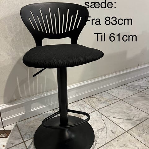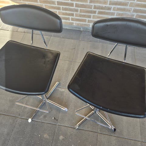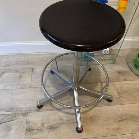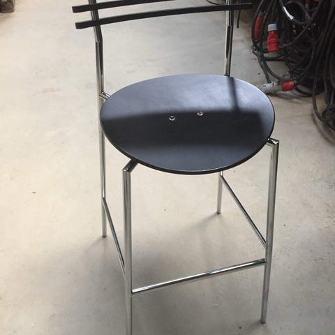 Sort med crom. Der sidder 2 kugler under sædet til at justere højden med det er det specielle ved denne stol. De fleste har en stang man justere med. Mærke i bunden everite/everbite. Har ikke fundet en hel magen til.
