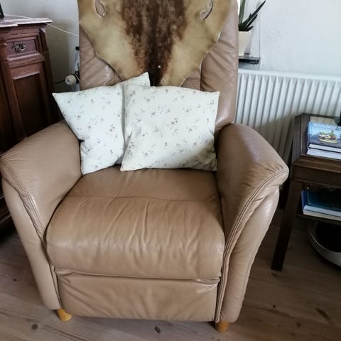 NU KUN 2 stk. læderstole fra My Home, med glidende vippefunktion og fodskammel med opbevaringsrum til f.eks. fjernbetjeninger, opladere m.m. Nypris kr. 4.995,- Har stået i ikke ryger hjem, og har i dagligdagen været beskyttet af lammeskind. (se foto nr. 6)