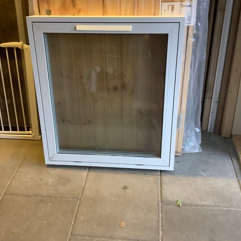 Vindue i hvidt træ, alu skinne under hvert vindue. De to nederste kan åbnes.