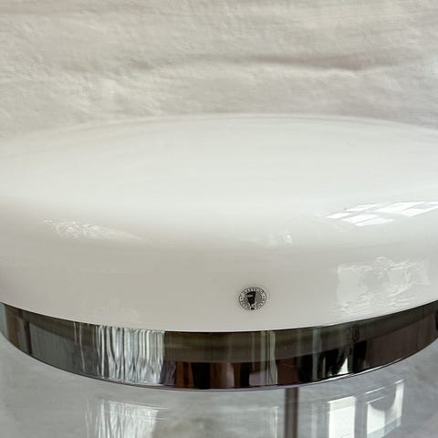 Elegant lampe fra ca. 1970’erne–1980’erne med front i gylden messingfarvet metal, formet i et karakteristisk cirkelmønster. Indrammet i hvid plast, som giver et let og rent udtryk. Lampen kan monteres både på loft og væg og skaber et flot, varmt lys med dekorativ refleksion.