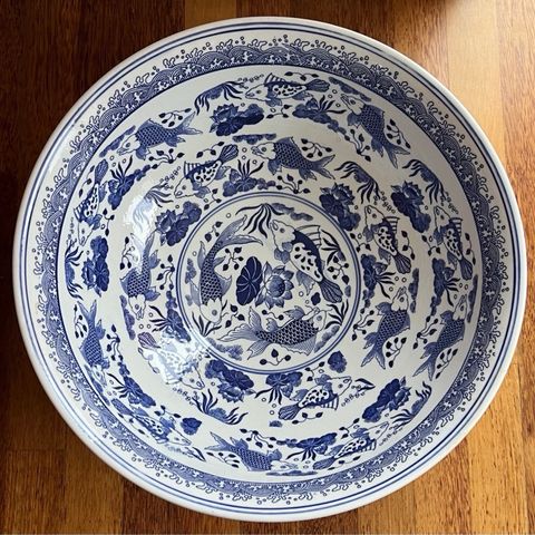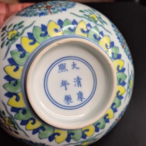 Polykrom dekoreret porcelænsskål, antageligt kinesisk Imari, fremstillet omkring slutningen af Qing-dynastiet (19. århundrede). Skålen måler 19 cm i diameter og 9,5 cm i højde, og fremstår i perfekt stand med intakt emaljemaling og velbevaret glasur. Dekorationen består af rigt ornamenterede blomstermotiver i Imari-paletten – typisk rød, blå og grøn – suppleret med abstrakte og symbolske elementer. På siden ses “den hellige perle”, en af de buddhistiske offergaver, som symboliserer visdom og spirituel oplysning.