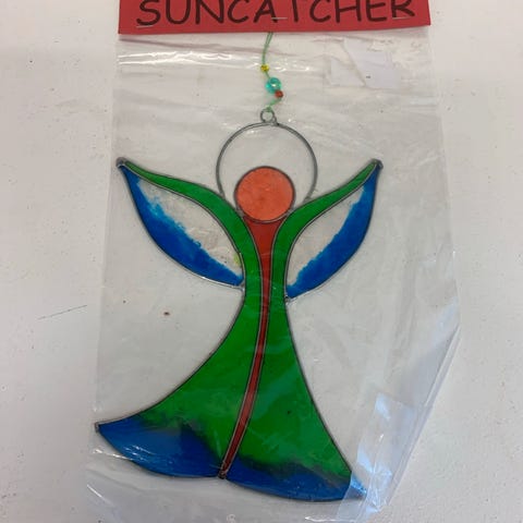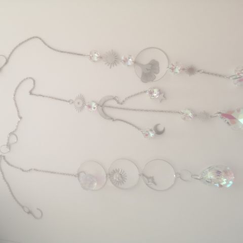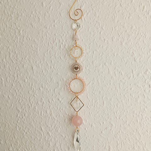 Ny håndlavet solfanger til at hænge. Lyserøde og gyldne toner. Med glasperler, halvædelsten (rosakvarts) og krystal vedhæng.