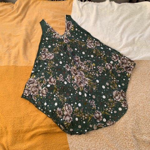 Sart rosa med lille blondekant rundt ærme, hals. Kan bindes foran som empire-look - eller bagpå for en lille taljeret effekt. Bomuld. Fint sart blomstermønster i hvidt og sart mintgrønt. Passer en stor S - Almindelig M - eller 38/40. Nypris ca. 900 kr.