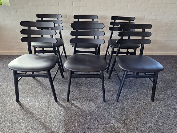 10 nye Camilla stole i massivt sort bejdset egetræ med sort ægte læder sæde.