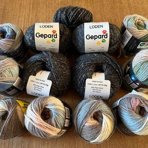 Lækkert gepard loden garn i 4 farver til trøje opskrift , sort, mørk grå , lys grå, rust, 600 gram i alt ,ubrugt garn + opskrift , nypris 750 kr,