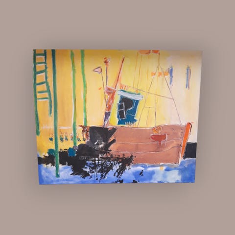 Smukt havnemotiv i dejlige farver. L’armada sous la pluie. Kunstneren er fransk og hedder Nouvel. Olie på lærred - mål 31 x 40 cm.