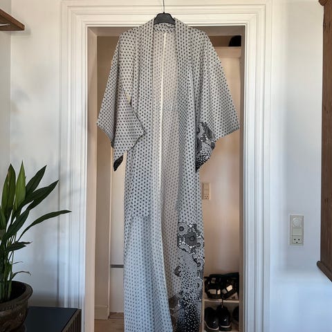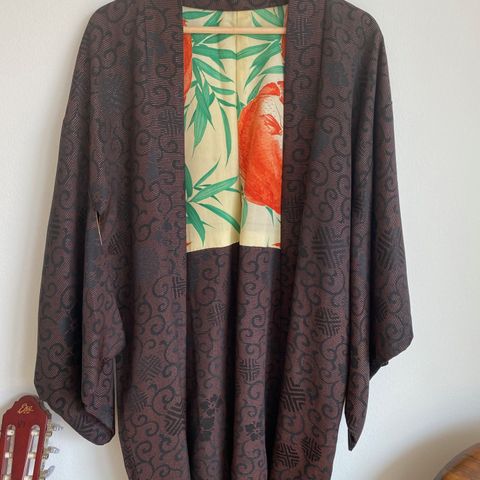 Skøn gammel japansk kimono. Super flot start og så smukke farver. Striber med tynd indvævet sølvtråd. Se foto