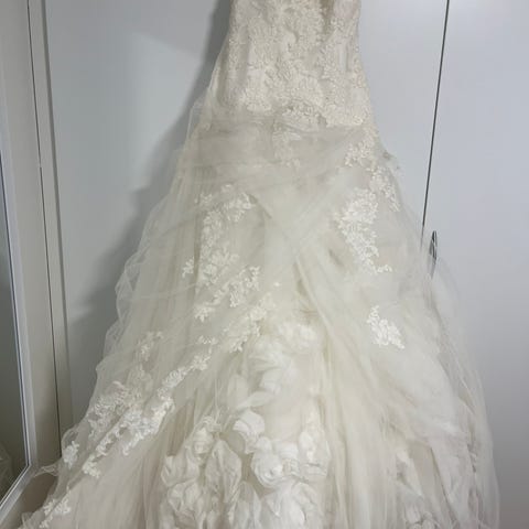 Nyrenset, slør kan medfølge og papkasse og papir så kjolen kan opbevares uden at blive gul.