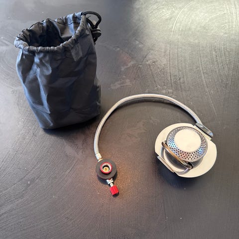 Lille smart stormkøkken "Jetboil" lignende system med gasbrænder der passer ned i gryden.