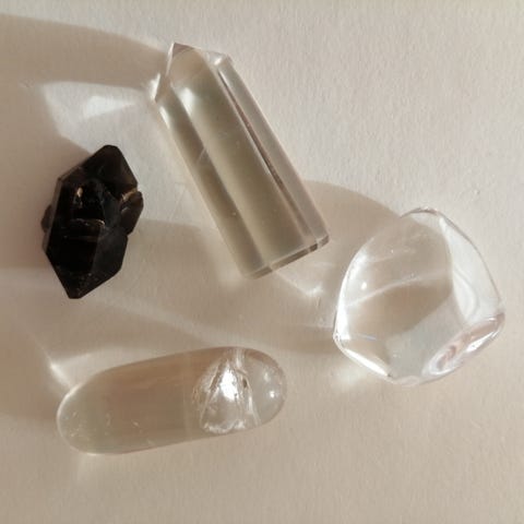 Fin polerede krystaller af naturlig bjergkrystal og røgkvarts