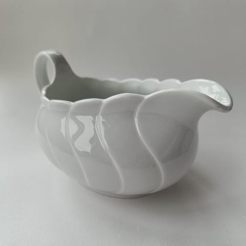 Smuk hvid sovsekande med hank, riflet look og bølget kant.