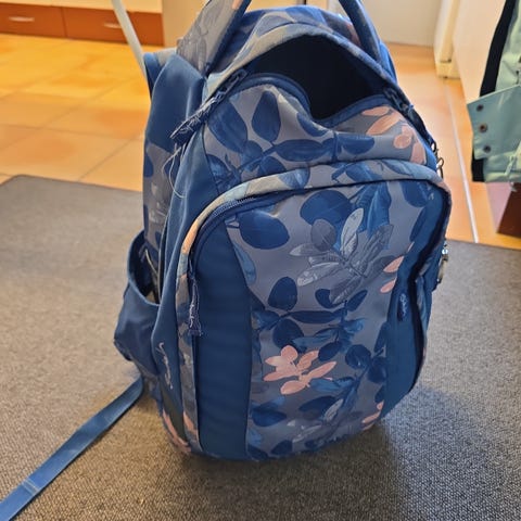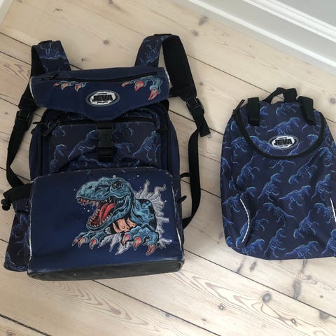 Flot skoletaske med 5 rum og idrætstaske. Der er stort rum til bøger, rum til penalhus, rum til ti-mad, lomme til nøgler, isoleret rum til madpakken og plads til drikkedunk på siden. 0-2. klasse.