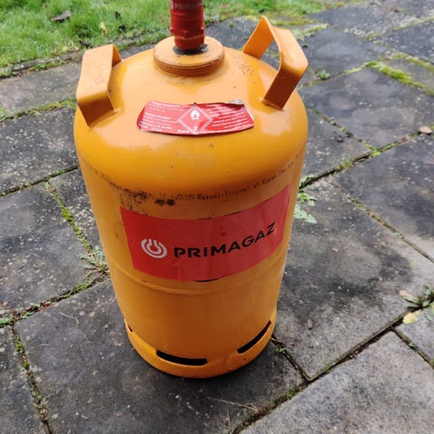 Klosan gas flaske sælges den er tom, men nem at få fyldt hos diverse byggemarkeder og lign.