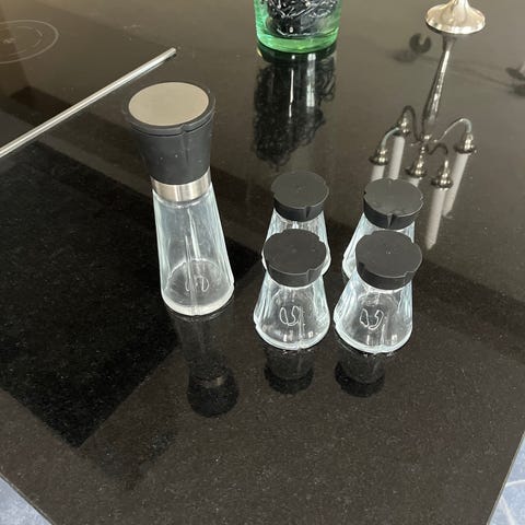 Beholderne er lavet af glas, og kværn/låg er lavet af sort plast og metal.