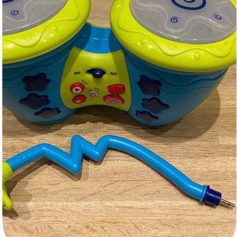 Den ene trommestik mangler hoved. Det har ingen betydning for funktionalitet. Der medfølger ikke manual.