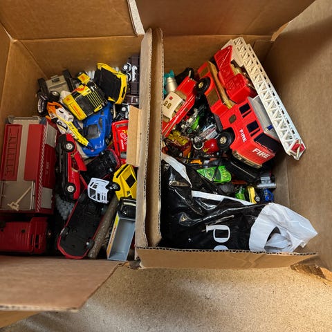 En kasse med biler i flere størrelser, mange er som helt nye og nogle har synlige brugsspor.