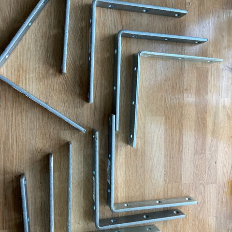 Vinkeljern, PN vinkelbeslag 105x20x2,5 mm. Galvaniseret blå. Har 10 æsker med hver 25 stk. Nypris i Silvan er kr 37. Sælges for kr 6 pr stk eller pr æske kr 100 (bud modtages ved køb af flere æsker)