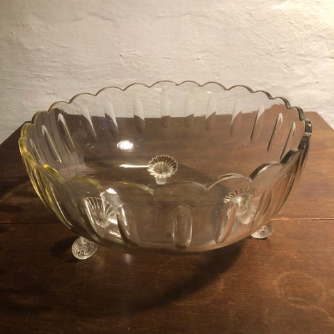 Smuk og unik vintage glasskål med en bølget, organisk form. Formodentlig fra finsk eller svensk glasværk, 60-erne/70-erne. Skålen har en fin tekstur med riller og små 'dråber' i glasset, der stråler ud fra midten. Lyset reflekteres i glassets overflade og fremhæver dets detaljer og gennemsigtighed. Tung og lækker kvalitet. Perfekt stand. Diameter 21 cm.