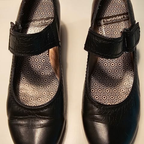 Fantastisk smukke højhælede sko i sort læder med chunky blokhæl fra det spanske kvalitetsmærke Wonders. Fine udskæringer og justerbar rem.