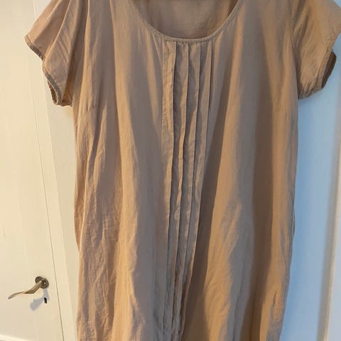 Kortærmet lårkort kjole med bånd i kraven. Lidt flæser forneden. Lys brun, lattefarvet. Henriette Steffensen str L. Syningen er gået en lille smule i udskæringen. Jeg har ikke forsøgt at sy det. Ellers fin stand. Bomuld. Dejlig at have på.