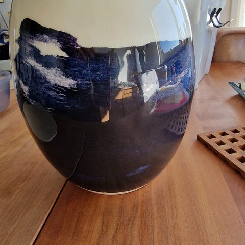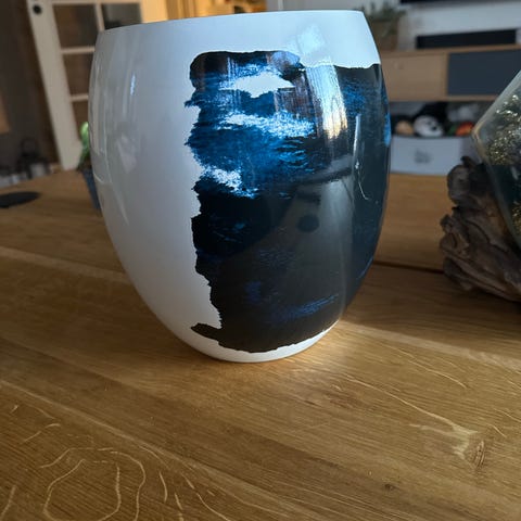Mønsteret er håndlavet, så hver vase har sit eget udtryk. Farve: Horizon. Højde: 17,8 cm. Diameter: 13,1 cm. Materiale: aluminium. Design: Bernadotte og Kylberg.