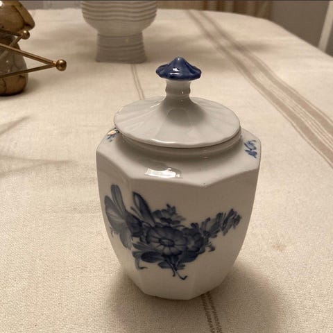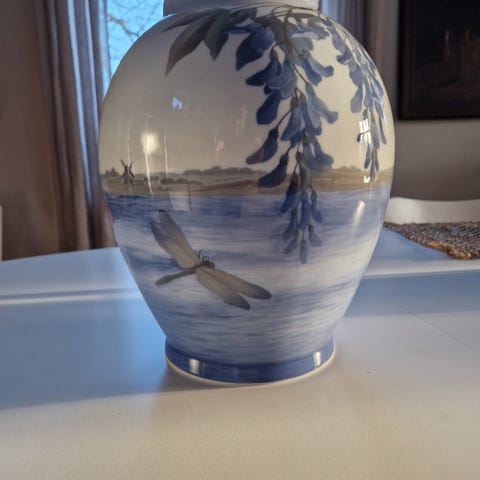 Dekoreret i blåt og hvidt i med billeder af en nøgen kvinde og en valmue.
