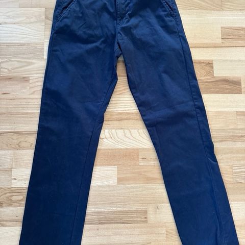 Mørkeblå, bløde bukser med grønne striber i siderne.