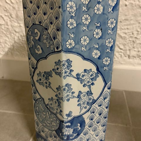 Stor vase / paraplyholder med motiv fra øsen måler 47cm høj og 22cm i diameter top. Hel og fin stand pris 300kr