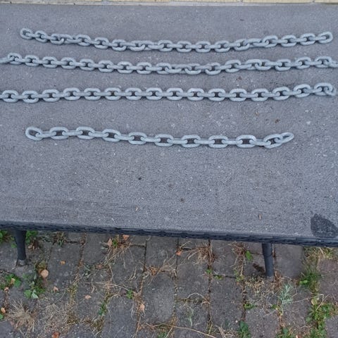 Kraftig kæde. 10 mm. Ledlængde 45 mm. 1 styk 2,2 m kr. 250. 1 styk 3,0 m kr. 400.