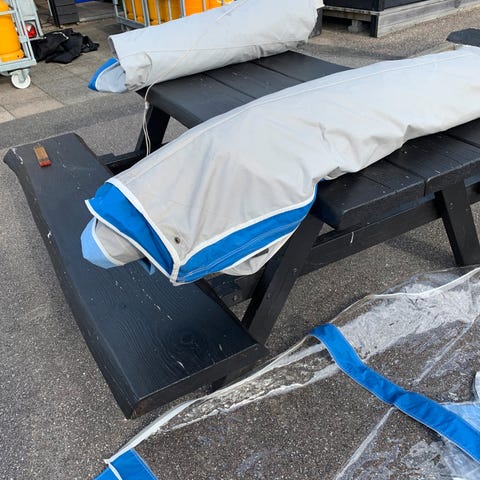Solsejl med sider i ender og lette stænger kan hentes i Rågeleje og på Møn efter aftale