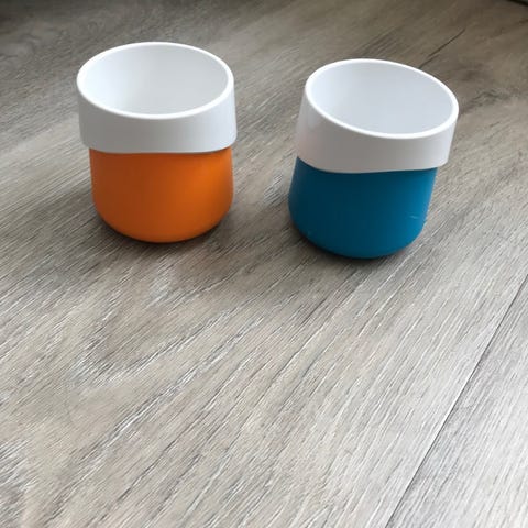 Plast kopper med silikone låg, Ukendt, 2 stk plast krus med silikone låg og fingerbeskytter.