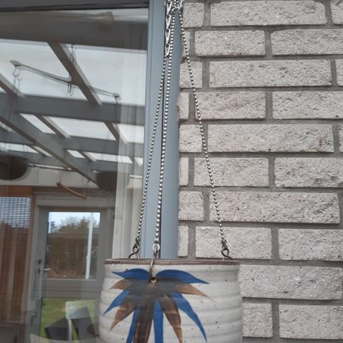 Fin grøn keramik potte med snore til ophæng af planter. 12 cm. høj og 14 cm. i diameter,