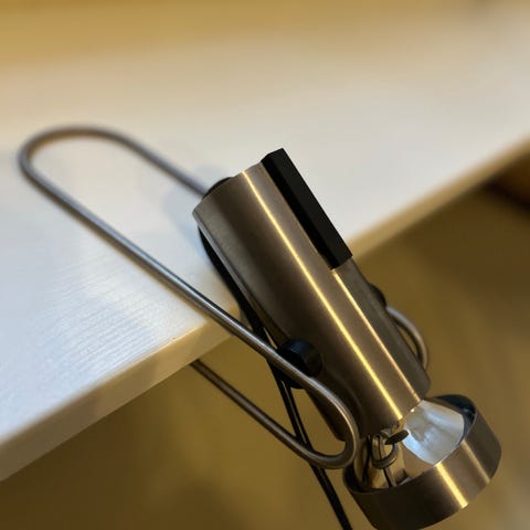 Bordlampe med stel af rustfrit stål og hvidlakeret lampehus. Udgået model.