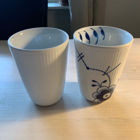 Royal Copenhagen Termokrus i Blå Mega Riflet, 26 cl. Begge kopper er 1. sortering og i god stand uden synlige brugsspor. Sælges for 300 kr. pr. stk.