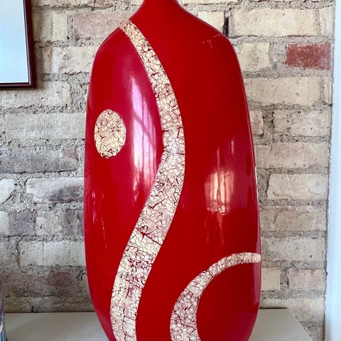 Forvandl dit rum med denne fantastiske høje vase – den perfekte kombination af moderne elegance og naturinspireret design. Dens flydende silhuet krones af calla-liljens skulpturelle form, mens den teksturerede, mosaiklignende overflade tilføjer dybde og sofistikering.