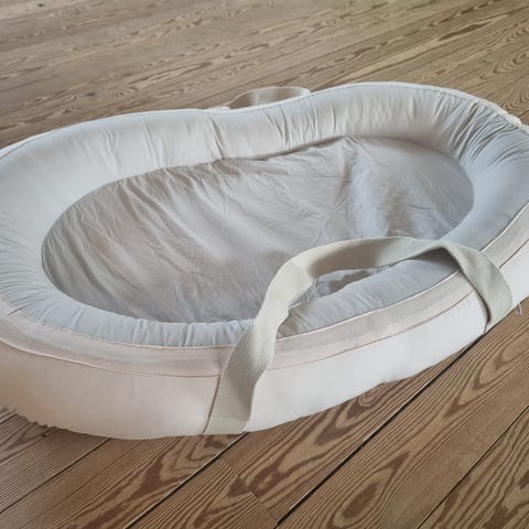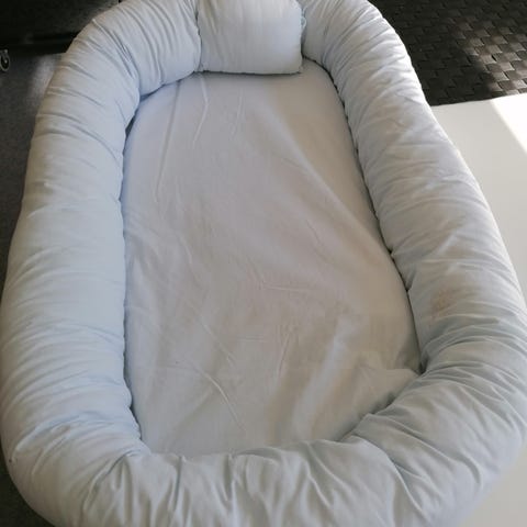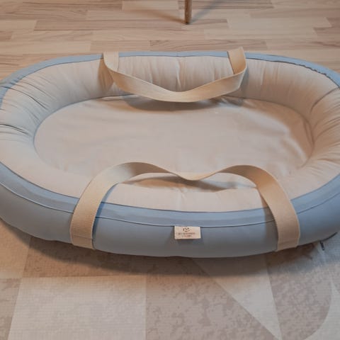 Copenhagen colors baby nest, stribet lyseblå. Er vasket med parfumeri Sæbe. Nyvasket stadig flot uden pletter, aftageligt betræk. Kan sendes