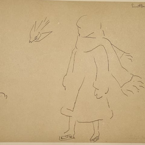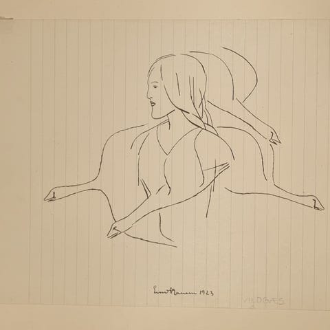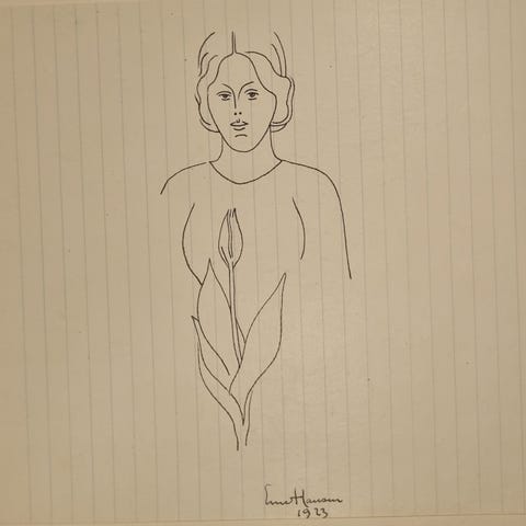 Ernst Hansen. 4 originale tegninger. 1923-1927. Kvinde Blomst Hund Fugle.