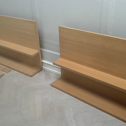 Custom snedkerbygget boghylde i massiv eg. Eget design og bygget af Another Woodworker. Har hængt i showroom og fejler intet. Den er fantastisk til bøger eller kunstværker. Bemærk længden - den kræver lidt plads.