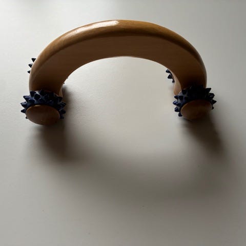 I elfenbensfarve og lyseblåt hårdt gummi til massage.