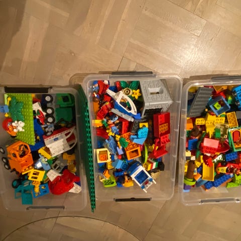 God blanding LEGO Duplo (klodser, biler, slanger, flyvemaskine, vinduer, døre og diverse tilbehør).