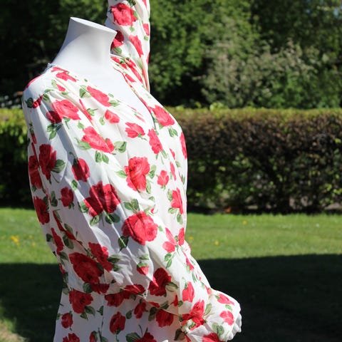 Whiite kjole i multifarvet design. Størrelse S. Slå-om kjolen har lange ærmer og et mønstret stof. Velegnet til hverdagsbrug eller særlige lejligheder. Fremstillet af enten materiale bomuld/viscose