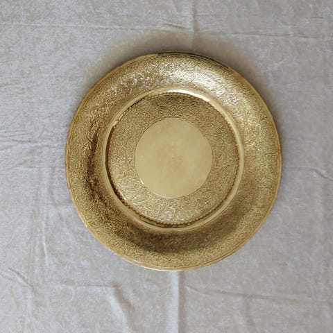 Messingbakke, Smuk rund messingbakke ø 35. Med mønster ridset ind i. Kanten har formentlig været løs på et tidspunkt og er blevet limet på af noget sølvagtigt materiale - se sidste billede.