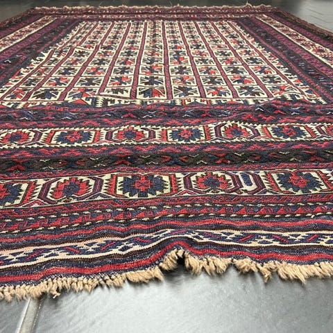 Tæppet er i god stand med minimalt slid, og farverne er stadig klare og levende.