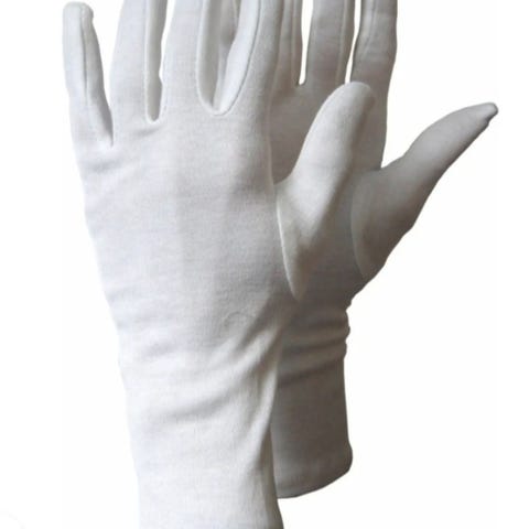 Et par hvide bomuldshandsker i str. 9 med velcro luk. Handskerne fremstår som nye.