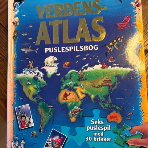 Mit første verdensatlas, Shaun das Schaf (dyr) , Puslespilsbog, puslespil, 1. Mit første verdensatlas, 6 puslespil kort over de mest kendte verdensdele og detaljer herom, 80 kr