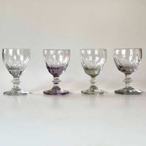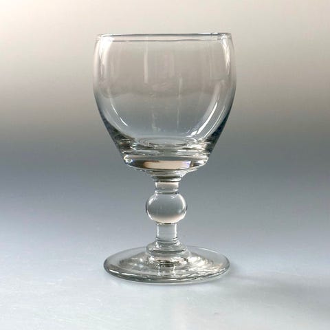 Et mundblæst vinglas i klassisk “Tønde” eller “Baril”-form, fremstillet omkring 1860. Glasset måler 10,3 cm i højden, med en kumme-diameter på 5,3 cm og en foddiameter på 5,9 cm. Kummen er svagt indadgående og bærer tydelige spor af håndværket: små luftbobler indlejret i glasmassen og et markant “knæk” i overgangszonen mellem kumme og stilk, som vidner om den manuelle drejning og afsætning under produktionen. Den brede fod og korte stilk uden knop er typiske for perioden og giver glasset både stabilitet og et rustikt udtryk. Denne type glas blev anvendt til vin og spiritus og er repræsentativ for dansk brugsglas fra midten af 1800-tallet, hvor funktionalitet og håndværksmæssig variation gik hånd i hånd.