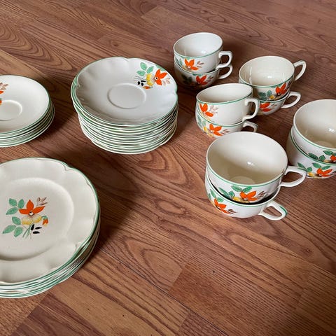6 Flotte røde store te underkopper/ desserttallerkner fra Johnson Bros England model Old Britain Castles Ø 18 cm sælges samlet 175,-kr. fragten aftales individuelt.